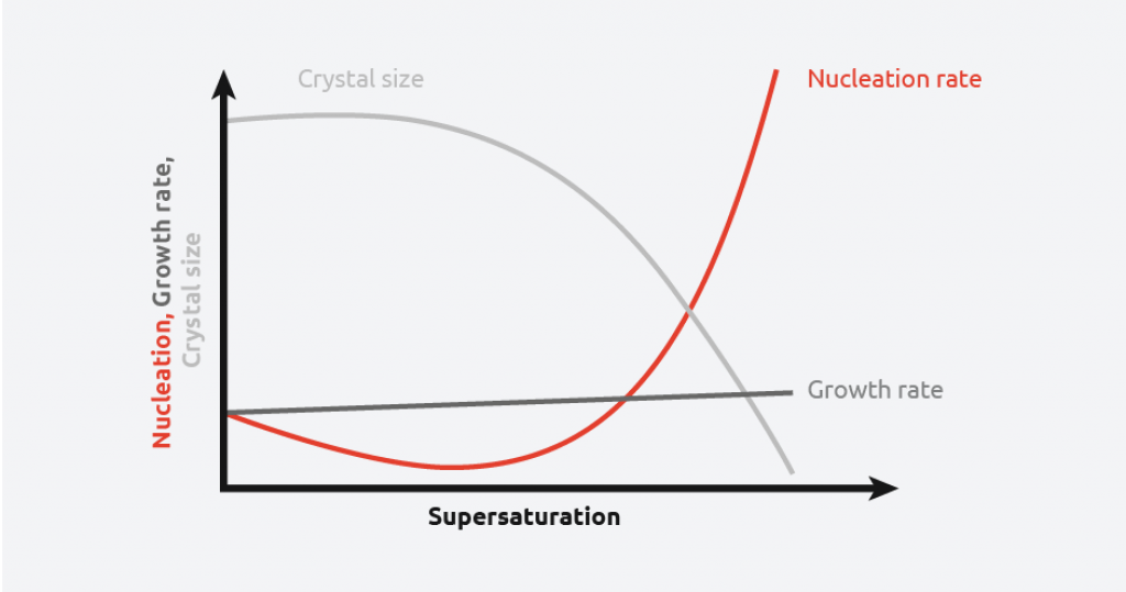 As can be seen from the above schematic, at low levels of supersaturation, crystals grow more quickly than they nucleate resulting in large crystal size distribution. At high supersaturation levels, nucleation dominates crystal growth, providing smaller crystals. This makes understanding and controlling supersaturation vitally important when creating crystals of a desired size and distribution.